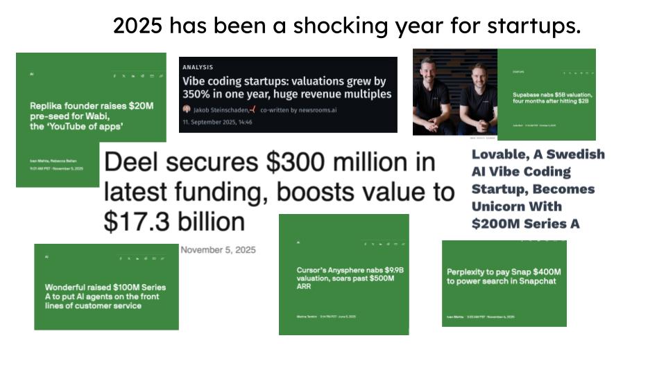 As we look back on all of the headlines this year, 2025 a shocking year for startups. In Silicon Valley many of the traditional best practices for fundraising no longer make sense for early stage companies. We've seen a $20M pre-seed round, well-funded startups raising another monster round just a few months after their last (Supabase's valuation grew from $2B to $5B in only four months), and vibe coding as a category grew 350%.