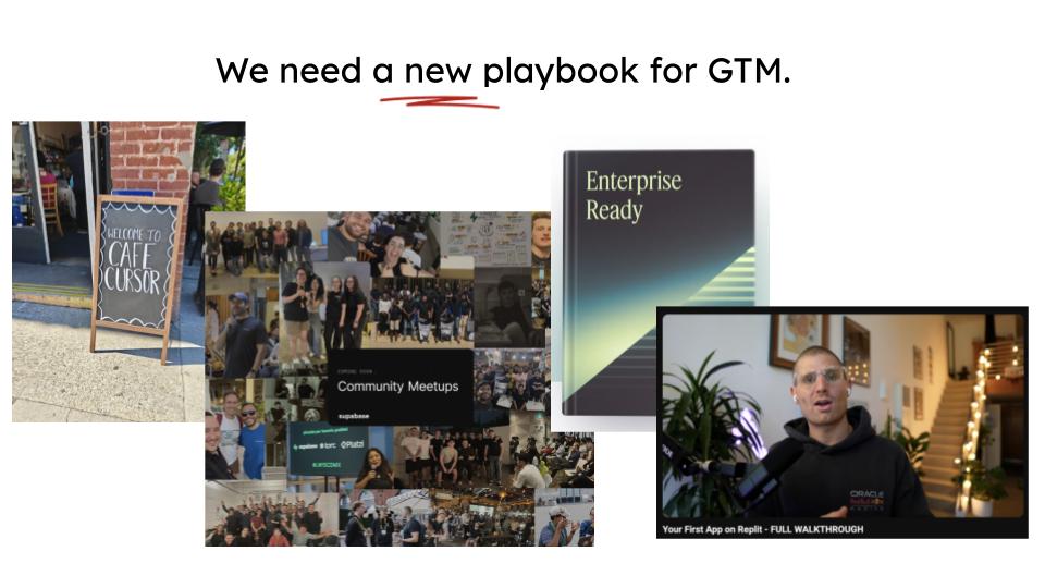We need a new playbook for GTM. One that's uniquely designed for engaging with potential users in a way that's modern, relevant, and not cringe. The old school way of doing things won't connect with people today, especially as we see people from all industries vibe coding their way through all types of business opportunities.