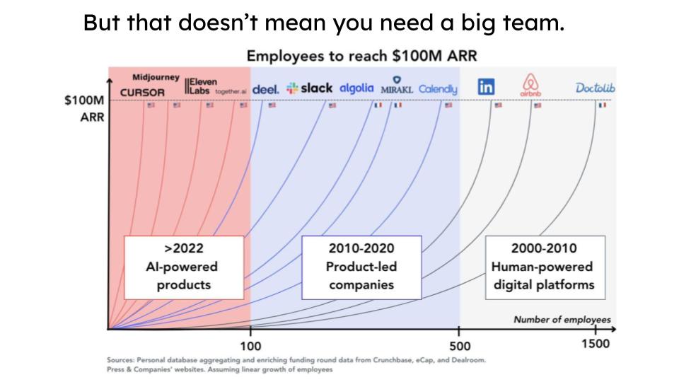 This playbook also can't reply on the old school way of thinking about hiring. There's no shortage of good sounding advice on who to hire next, however 90% of this advice is now completely irrelevant. As early stage companies are the first to adopt AI across every job to be done, many roles and responsibilities are now converging and traditional job titles are completely irrelevant. It's important to take an honest look at what needs to be built and assess how you can deliver results with the fewest amount of full-time employees.