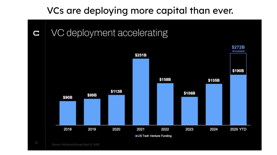 There's no doubt VCs are deploying more capital than ever. This year alone, VCs are expected to deploy $272B. Even more than 2021, a shockingly busy year for investors as the pandemic accelerated growth in businesses that enabled remote work, virtual healthcare, and all of the services brought online to keep the global economy afloat.